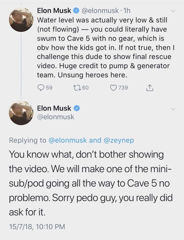 Liên quan đến chiến dịch giải cứu đội bóng nhí Thái Lan. Tỷ phú Mỹ Elon Musk và thợ lặn người Anh đã có tranh cãi qua lại về chiếc tàu ngầm mini của ông Elon Musk dùng để giải cứu đội bóng. Sau khi xúc phạm thợ lặn Anh, ông Elon Musk mới đây đã lên tiếng xin lỗi.