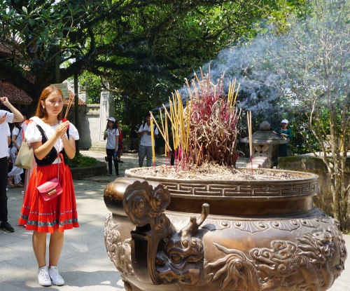Quỳnh mặc trang phục Czech thắp hương tại Đền Hùng. Ảnh: Trọng Giáp