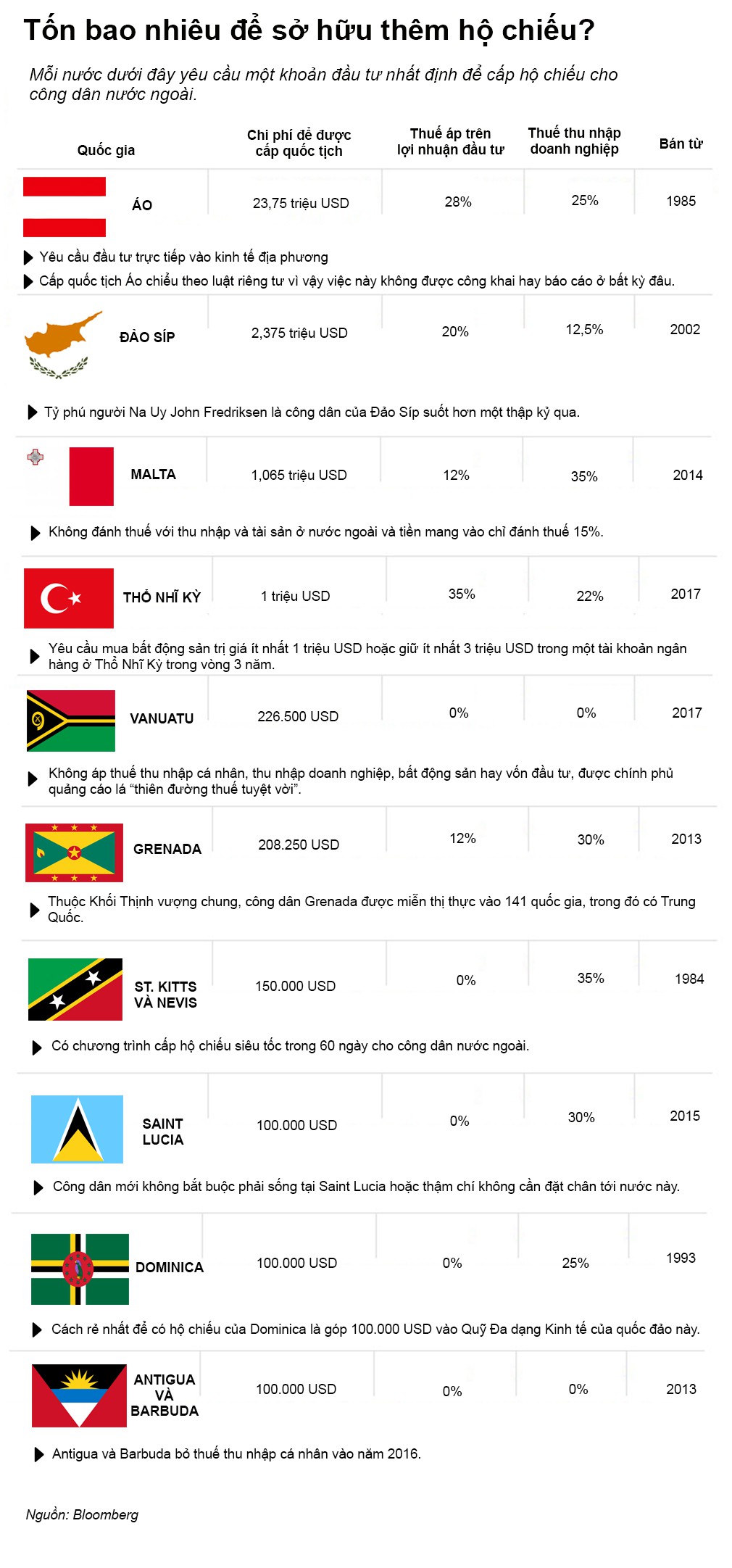 Trong khi nhiều quốc gia, bao gồm cả Mỹ, cho phép các cư dân hợp pháp xin quốc tịch Mỹ sau khi đáp ứng một số điều kiện nhất định, 10 quốc gia giới đây cấp quyền công dân cho người nước ngoài thông qua hình thức đầu tư trực tiếp, đặc biệt là vào bất động sản hoặc một doanh nghiệp bản địa. 8 trong số 10 quốc gia này được xem là những trung tâm tài chính với những ưu đãi về thuế hấp dẫn.