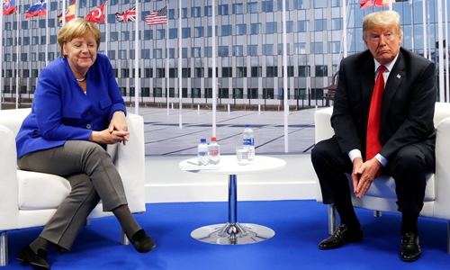 Tổng thống Mỹ Trump (phải) và Thủ tướng Đức Angela Merkel nói chuyện bên lề hội nghị NATO tại Bỉ ngày 11/7. Ảnh: Reuters.