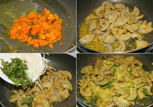 Bước 6: Xào chung lòng với hành, đảo đều khoảng 30 giây, sau đó cho hành lá + mùi tàu + ớt thái vào đảo đều 30 giây nữa. Cuối cùng tắt bếp. Có thể cho thêm 1 thìa cà phê bột ngọt nếu thích.