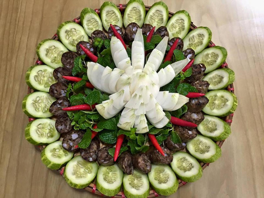 Múc lòng heo ra đĩa. Dùng khi còn nóng và kèm với rau thơm. Hoặc bạn có thể ăn kèm bánh tráng mè nướng vị rất lạ và ngon.