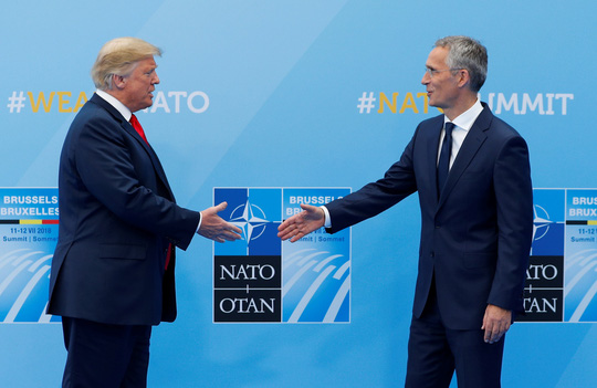 Tổng Thư ký NATO Jens Stoltenberg đón Tổng thống Mỹ Donald Trump tại Hội nghị Thượng đỉnh NATO ở thủ đô Brussels - Bỉ hôm 11-7 Ảnh: REUTERS