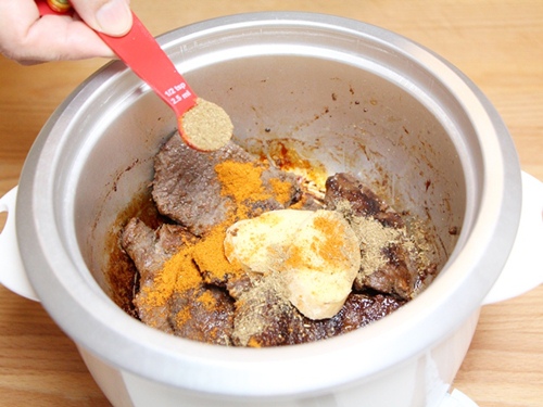 Bước 4: Khi nào nút nấu ăn nhảy lên lại lật thịt. Thêm bột ớt, gừng, bột thì là vào. Đảo đều cho đến khi nào thịt bò chín và khô hẳn.