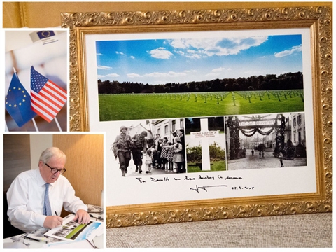 Lãnh đạo EU đã tặng ông Trump một món quà, đó là bức ảnh nghĩa trang. Ông Juncker nói món quà không mang bất cứ điềm gở nào, mà chỉ mang ý nghĩa biểu tượng để nhắc nhở về lịch sử chung giữa Mỹ và EU.