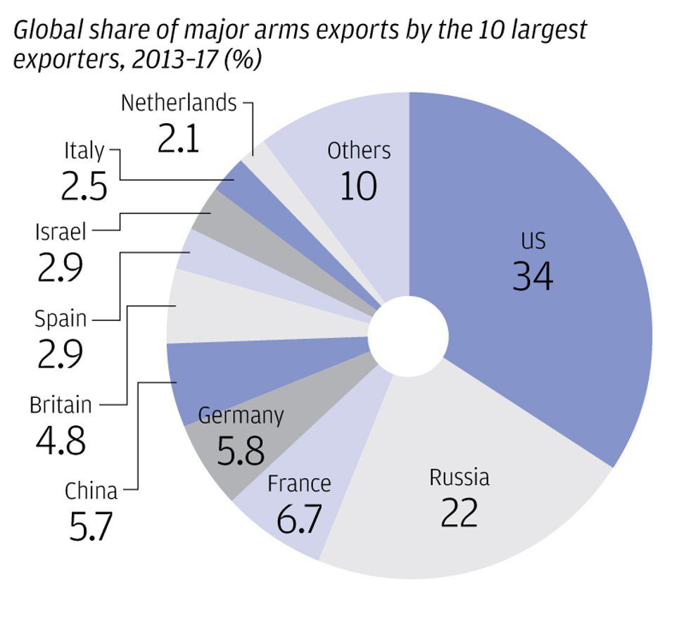 Trung Quốc chiếm 5,7% trong thị phần xuất khẩu vũ khí thế giới từ năm 2013-2017. (Nguồn: SIPRI)