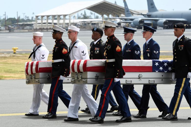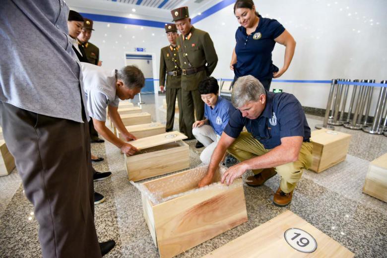 Tại căn cứ Pearl Harbor-Hickam ở Hawaii, Phó Tổng thống Mỹ Mike Pence ngày 1/8 đã chủ trì lễ đón nhận 55 bộ hài cốt từ Hàn Quốc trở về Mỹ. Sau lễ đón nhận, các chuyên gia Mỹ đã bắt đầu quá trình xác định ADN để xem đó có phải là hài cốt của binh sĩ Mỹ hay không và nếu đúng thì đó là hài cốt của ai.