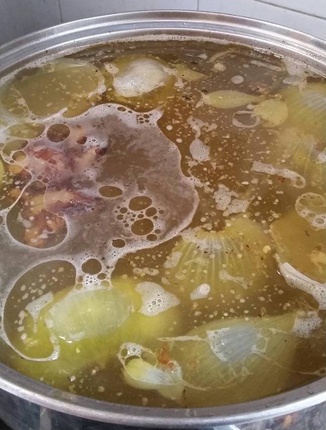 - Nước dùng: sau khi vớt gà cho hành khô + gừng đã nướng vào ninh thêm 30 phút nữa thì cho hành tây bổ đôi vào.