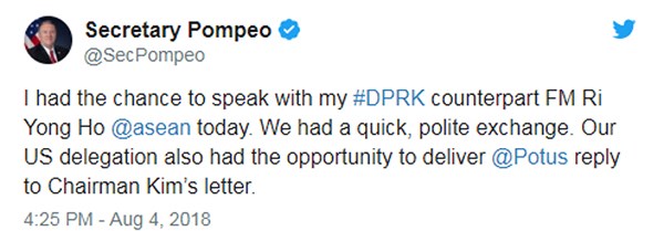 Ông Pompeo chia sẻ trên Twitter: “Tôi đã có cơ hội nói chuyện với người đồng cấp Triều Tiên, Bộ trưởng Ngoại giao Ri Yon-ho tại diễn đàn khu vực ASEAN hôm nay. Chúng tôi đã có cuộc trao đổi nhanh và lịch thiệp. Phái đoàn Mỹ cũng đã có cơ hội chuyển thư trả lời của Tổng thống Mỹ đến nhà lãnh đạo Kim Jong-un”.