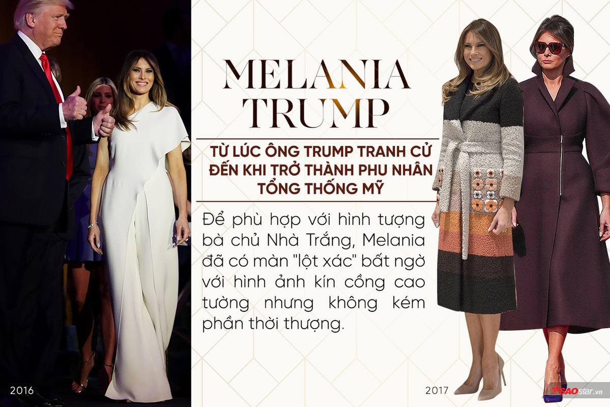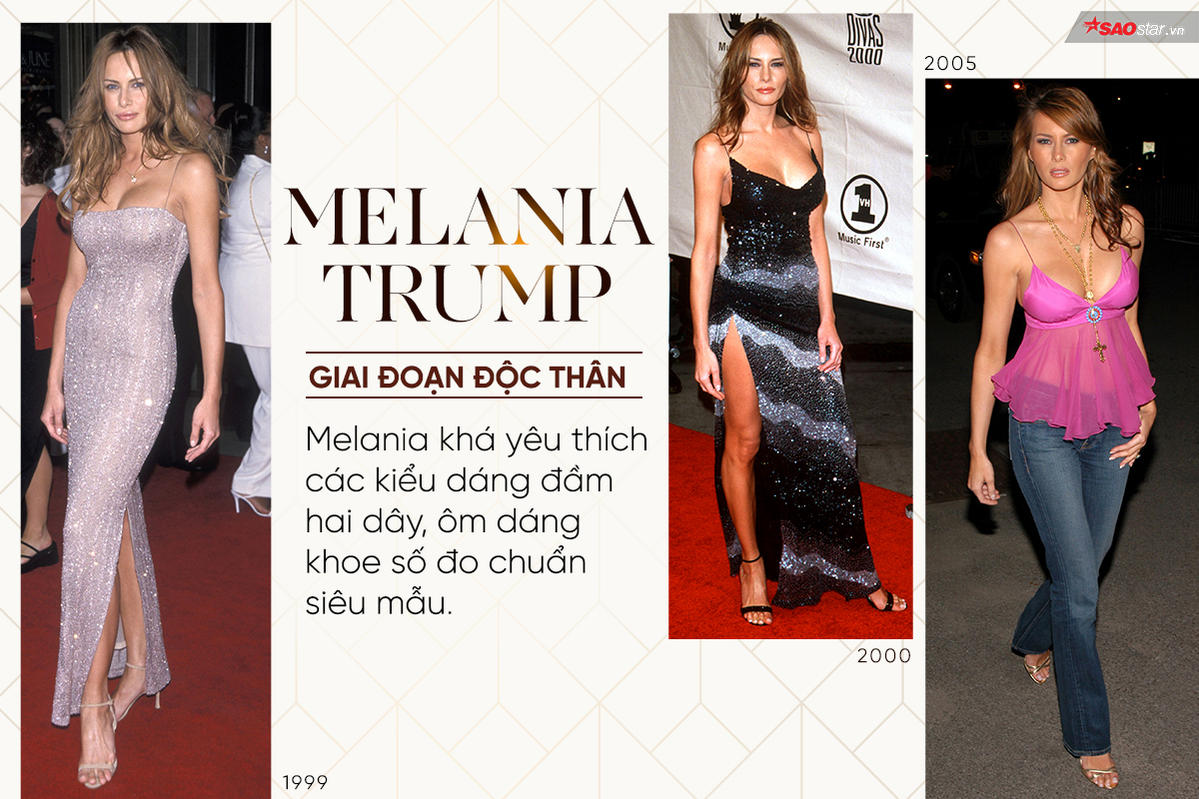 Có thể về kiến thức chính trị bà Melania Trump không thể so sánh nổi với Hillary Clinton, về tài hùng biện thì chắn chắn không bằng Michelle Obama nhưng bàn đến phương diện thời trang thì bà có thể tự tin hơn hẳn nhiều thời phu nhân trước. Dấu ấn thời trang của Đệ nhất phu nhân Mỹ có thể chia ra thành 3 thời kỳ chính: