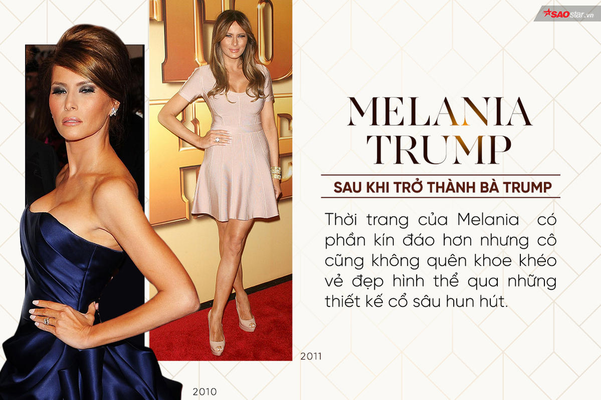 Từ đây, gu thời trang của Melania cũng có sự chuyển biến nhẹ nhàng. Dù vẫn yêu thích các thiết kế khoe vòng 1 và đầm ôm tôn vóc dáng, nhưng trang phục sau khi trở thành bà Trump của Melania có phần tiết chế các khoảng hở hơn trước.