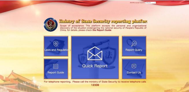 Vào tháng 4, văn phòng an ninh quốc gia của Trung Quốc đã thiết lập một trang web cho phép người dân báo cáo hoạt động đáng ngờ có thể đe dọa an ninh quốc gia cũng như bất kỳ người nào ở Trung Quốc bị nghi ngờ hoặc có các hoạt động gây nguy hiểm cho an ninh quốc gia.