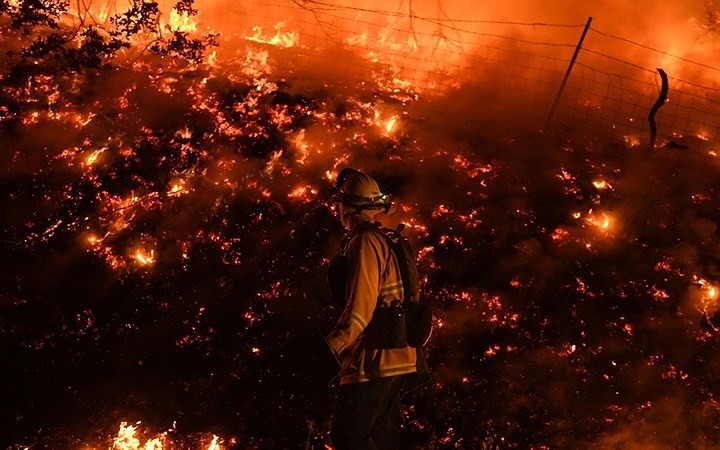 Người lính cứu hỏa giữa biển lửa. Ảnh: AFP/Getty