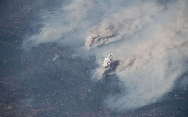 Đám cháy rừng tại khu vực Carr và Ferguson, bang California được nhà du hành vũ trụ Alexander Gerst chụp từ ngoài không gian hôm 3/8. Ảnh: NASA