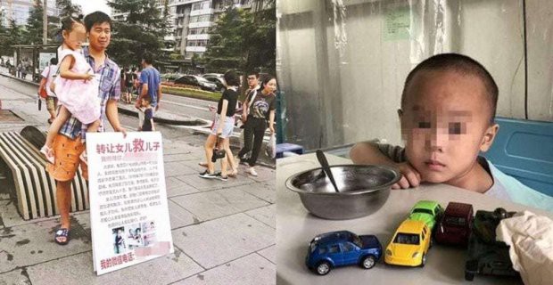 Truyền thông Trung Quốc mới đây đã dậy sóng với hình ảnh một người đàn ông bế một bé gái cùng tấm biển có ghi: "Bán con gái để cứu con trai". Theo Shanghaiist, nội dung trên tấm biển viết rằng con trai 4 tuổi của người đàn ông này đang mắc bệnh ung thư máu và gia đình không có tiền chữa bệnh. Nếu ai sẵn lòng trả viện phí cho bé trai, gia đình sẽ lấy bé gái 4 tuổi của gia đình để đổi.