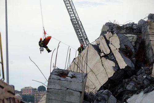 Cầu Morandi ở Genoa, miền bắc Italy, bị sập vào lúc 11h30 ngày 14/8 (16h30 giờ Hà Nội). Cảnh sát Italy cho biết ít nhất 35 người đã thiệt mạng và lo ngại con số này sẽ còn tăng lên. Hàng trăm lính cứu hỏa và chó nghiệp vụ được huy động tìm kiếm các nạn nhân bị chôn vùi.