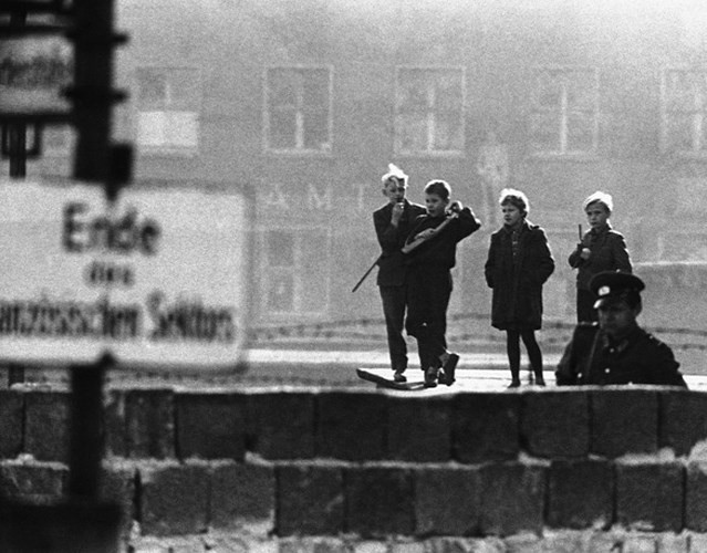 Bức tường Berlin ngăn cách Đông Đức XHCN và Tây Đức TBCN. Ảnh: các cậu bé đang công kênh nhau trên đường Liesen ở Wedding, Tây Berlin để nhìn qua bước tường về phía Đông, năm 1961.