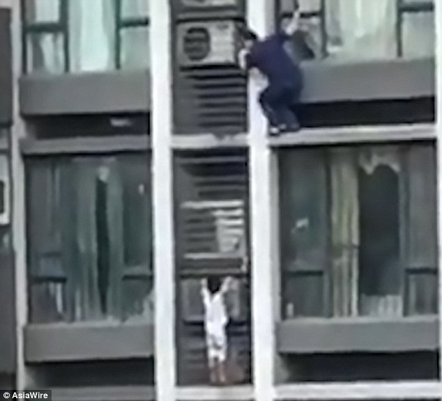 Nhận được điện thoại, người cha đã tức tốc chạy từ chỗ làm về 10 phút sau đó. Không thể nhìn con cứ lơ lửng ngoài ban công trong khi đội cứu hộ chưa có mặt, người cha đã liều mình trèo ra ngoài từ cửa sổ tầng 7 của nhà mình và men dần xuống để cứu con.