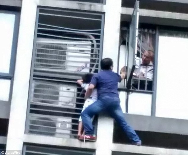 Trong khi ở nhà một mình thì cậu bé 7 tuổi ở thành phố Phật Sơn, tỉnh Quảng Đông, Trung Quốc bị trộm đột nhập vào nhà. Sợ quá, cậu trốn ra ban công tầng 7 nhưng không ngờ bị kẹt. Người bố đã mạo hiểm dùng tay không trèo ra giải cứu con mình an toàn.