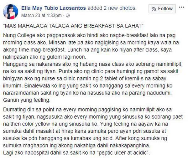Sau khi phải chịu hậu quả từ thói quen tai hại của bản thân, Ella đã quyết định chia sẻ câu chuyện của bản thân lên mạng xã hội để cảnh tỉnh mọi người hãy chú trọng tới bữa ăn sáng.