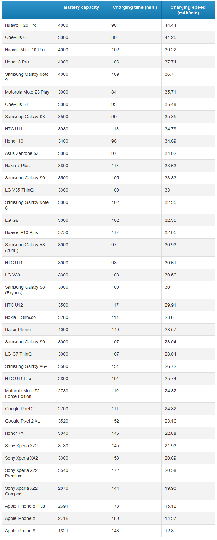 Như bạn nhìn thấy trong bảng xếp hạng, SuperCharge của Huawei chiếm ưu thế nhất, tiếp theo là OnePlus Dash Charge, tương đương với Oppo VOOC. Công nghệ sạc nhanh Adaptive Fast Charge của Samsung cũng rất nhanh khi mà có thể nạp đầy cho dung lượng pin 4000mAh của Note 9 chỉ trong chưa đầy 2 tiếng đồng hồ, trong khi Turbo Charge của Moto cũng đáng kinh ngạc về tốc độ sạc pin.