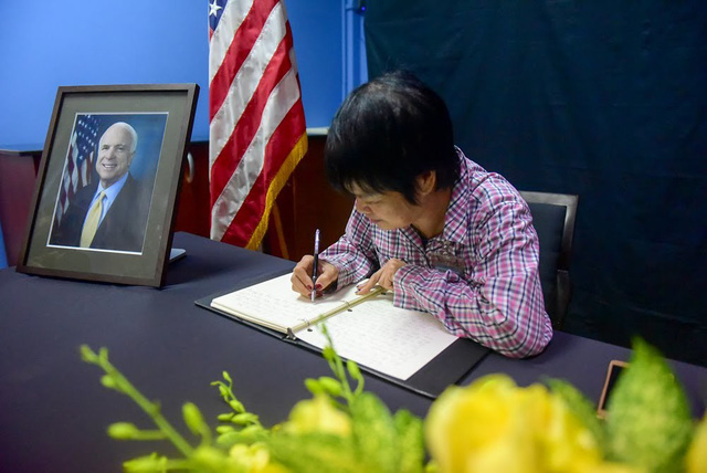 Sau khi Thượng nghị sĩ John McCain qua đời hôm 25/8, Đại sứ quán Mỹ tại Hà Nội đã quyết định mở sổ chia buồn trong hai ngày 27-28/8 tại Tòa nhà Vườn Hồng, số 170 Ngọc Khánh để phục vụ những người có mong muốn chia sẻ với gia đình ông McCain về sự mất mát này. (Ảnh: Reuters)