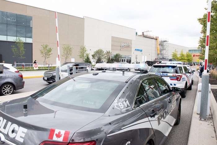 Một xe tuần tra của cảnh sát xuất hiện ngay bên ngoài Trung tâm mua sắm Yorkdale sau khi xảy ra vụ nổ súng.