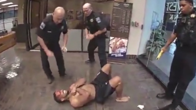 Harvey không chịu tra tay vào còng và cần 4 sỹ quan cảnh sát mới buộc nghi phạm tuân lệnh.