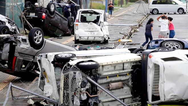 Một loạt xe ô tô bị gió thổi lật ngược trên đường phố Osaka. Ảnh: AP.