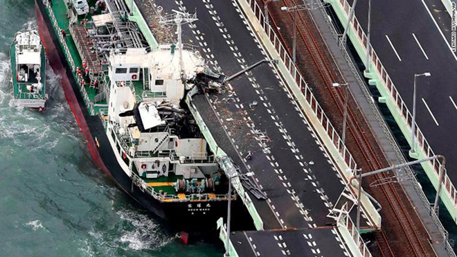 Tàu chở dầu nặng gần 2.600 tấn đâm vào cầu nối liền sân bay Kansai với đất liền, khiến cả cầu và tàu đều bị hư hại. Ảnh: AP.