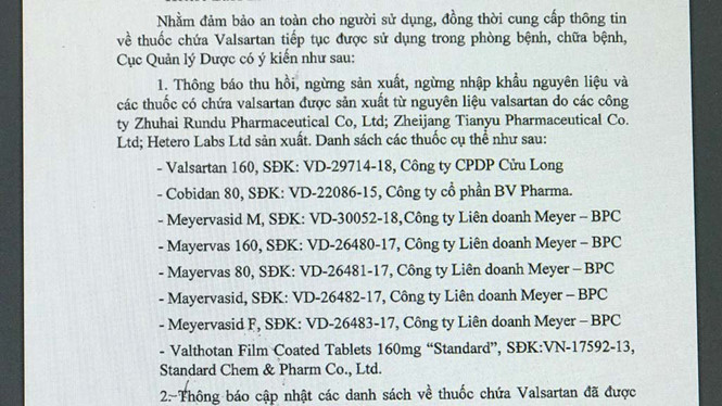 Trong danh sách thu hồi thuốc có chứa hoạt chất valsartan (được sử dụng trong điều trị một số bệnh lý về tim mạch, huyết áp) mới nhất vừa được thông báo trên website của Cục Quản lý dược (Bộ Y tế), Cục này đã bổ sung thêm 8 thuốc: valsartan160, SĐK: VD - 29714 - 18 (Công ty CPDP Cửu Long); Cobidan 80, SĐK: VD - 22086 - 15 (Công ty cổ phần BV Pharma); 5 thuốc của Công ty Liên doanh Meyer -BPC, gồm: