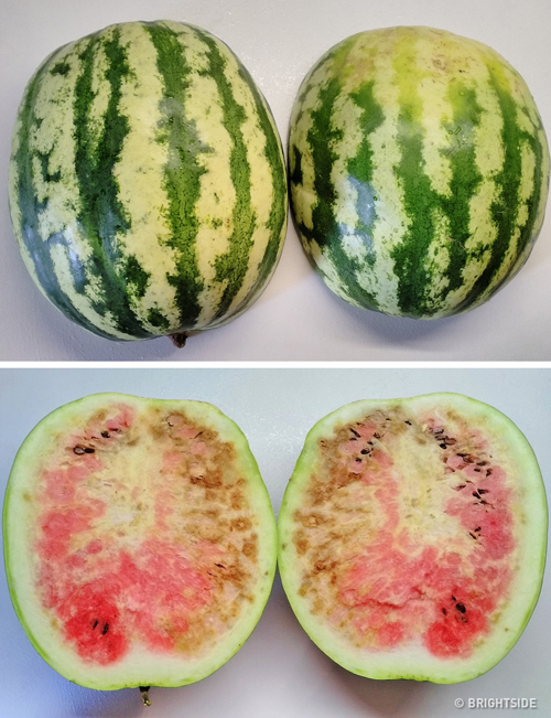 Một số ý kiến cho rằng lỗ hổng bên trong quả dưa là dấu vết từ các con côn trùng chứ không phải do nitrat. Nhưng tốt nhất, bạn vẫn nên tránh xa những loại quả có lỗ hổng bên trong, hoặc những phần dưa tách rời ra, không liên hết với cả quả như hình minh họa phía trên.