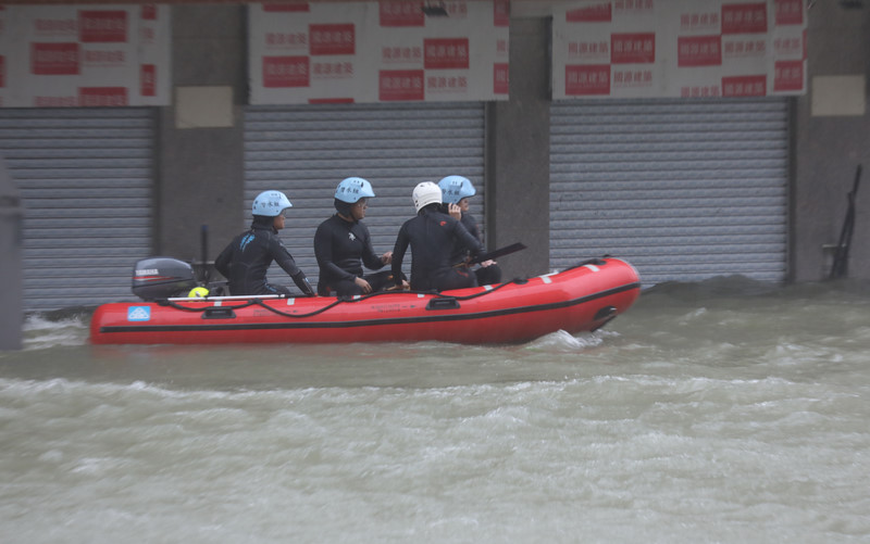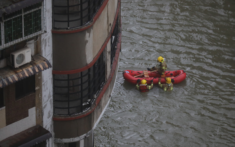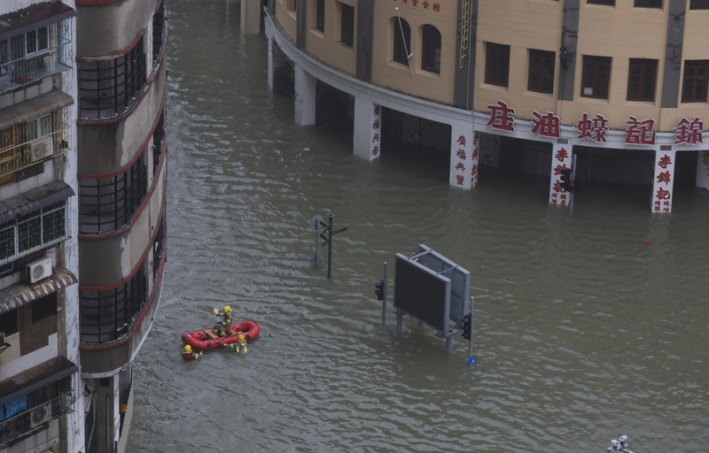Các cửa tiệm khắp thành phố đều được đóng ván gỗ hoặc chất túi cát. Những con đường vốn nhộn nhịp với du khách tham quan “thiên đường cờ bạc” giờ đều vắng bóng người. Đội cứu hộ phải dùng thuyền để di chuyển trên phố. Ảnh: SCMP.