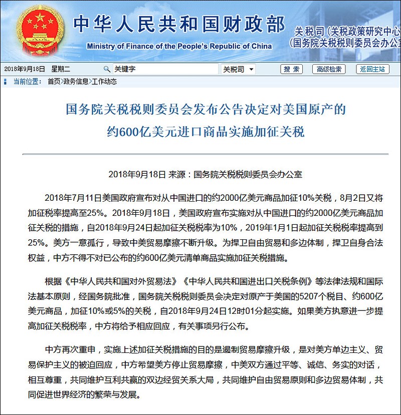 Sau đó ít phút, trang web của Bộ Tài chính Trung Quốc đã đăng quyết định của Ủy ban thuế quan Quốc Vụ viện về thực hiện tăng thuế đối với 60 tỷ USD hàng hóa Mỹ nhập khẩu. Bản quyết định chỉ trích hành động của Mỹ là tùy tiện ngang ngược, khiến cuộc va chạm mậu dịch giữa hai nước không ngừng leo thang; tuyên bố: Để bảo vệ thể chế đa phương, tự do mậu dịch và quyền lợi hợp pháp của mình, Trung Quốc buộc phải gia tăng mức thuế đánh vào 60 tỷ hàng hóa Mỹ như danh mục đã được Quốc Vụ viện phê chuẩn gồm 5.207 mặt hàng với các mức tăng 5% và 10%, thời gian có hiệu lực từ 12h01’ ngày 24/9/2018. Nếu phía Mỹ vẫn cố ý gia tăng mức thuế lên 25% thì Trung Quốc sẽ có sự đáp trả tương ứng sẽ công bố sau.