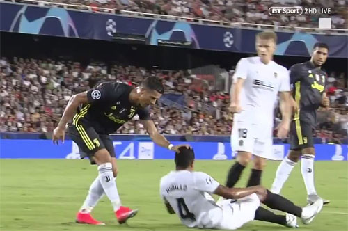 Trận đấu Valencia - Juventus mới bước sang phút 29, có va chạm giữa Ronaldo và Jeison Murillo. Cho rằng Murillo cố tình ngã xuống ăn vạ, CR7 dùng tay ấn đầu đối thủ. Hành động của anh đã bị trọng tài phạt thẻ đỏ trực tiếp.