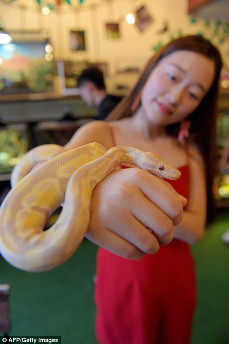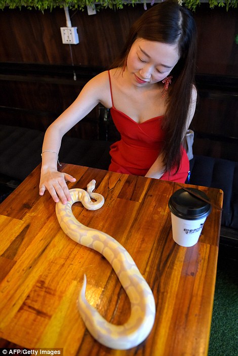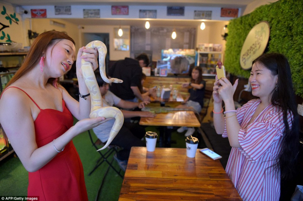 Sau khi rộ lên phong trào cà phê chó, mèo, giờ đây có thêm một mô hình cà phê mới xuất hiện: cà phê bò sát. Khi vào quán, khách hàng có thể vừa thưởng thức đồ uống, vừa chơi đùa với rắn, trăn hay thằn lằn...