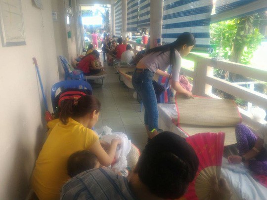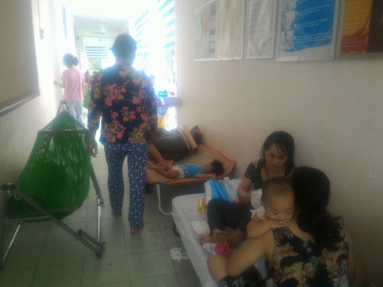 Bệnh nhi và người nhà nằm chen chúc nhau trong căn phòng chật hẹp vì quá tải. Ãnh: Trịnh Thiệp