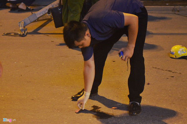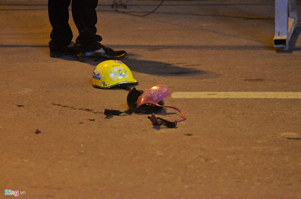 Nhiều mảnh vỡ vương vãi khắp nơi. Nạn nhân gục cạnh xe máy cùng chiếc mũ bảo hiểm vỡ nát, xung quanh hiện trường có nhiều vết máu.