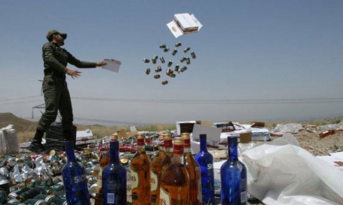 Một binh sĩ Iran tiêu hủy rượu bia trái phép năm 2015. Ảnh: AP.