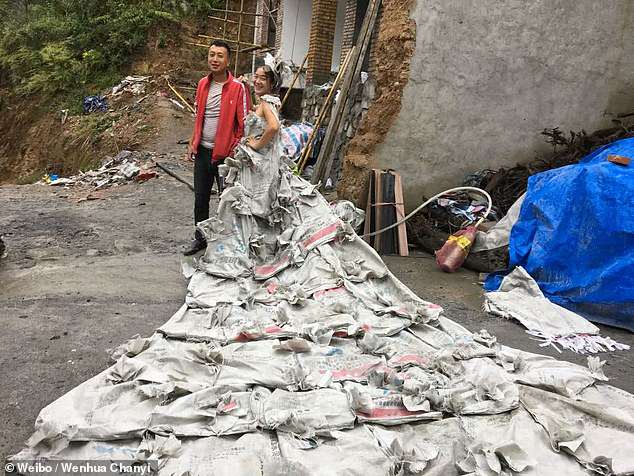 Tan Lili, 28 tuổi, đã tự thiết kế và may chiếc váy cưới dài thướt tha với 40 vỏ bao xi măng, sau khi sử dụng xi măng để sửa chữa nhà của cô tại một ngôi làng ở thành phố Lũng Nam, tỉnh Cam Túc, Trung Quốc.