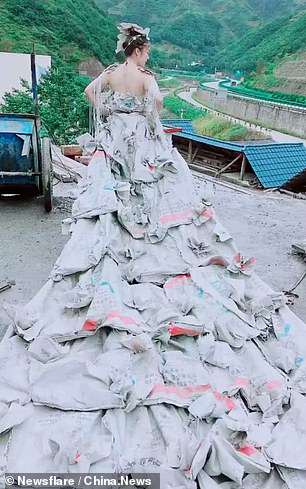 Trong khi phần lớn váy cưới được may từ chất liệu lụa và sa tanh, một cô gái ở tây bắc Trung Quốc khiến hàng triệu cư dân mạng bất ngờ với chiếc váy cưới từ vỏ bao xi măng.