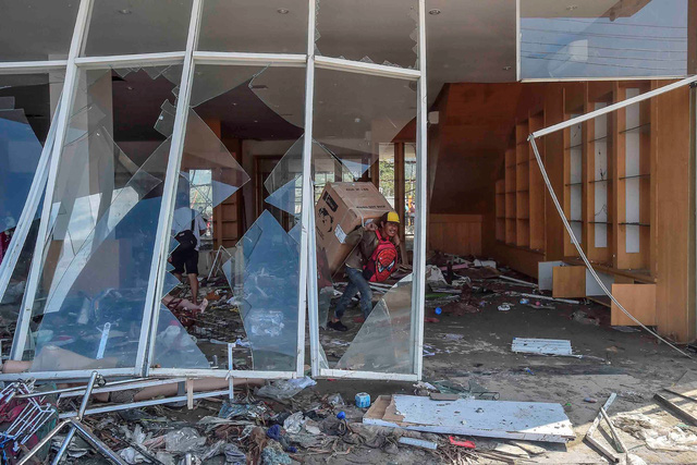 Hàng trăm người dân tại thành phố Palu, nơi vừa hứng chịu trận động đất và sóng thần kinh hoàng khiến hơn 800 người thiệt mạng hôm 28/9, đã bước qua những mảnh kính vỡ và những rào chắn bên trong các siêu thị và cửa hàng tiện lợi bị tàn phá để “hôi của”. (Ảnh: Reuters)