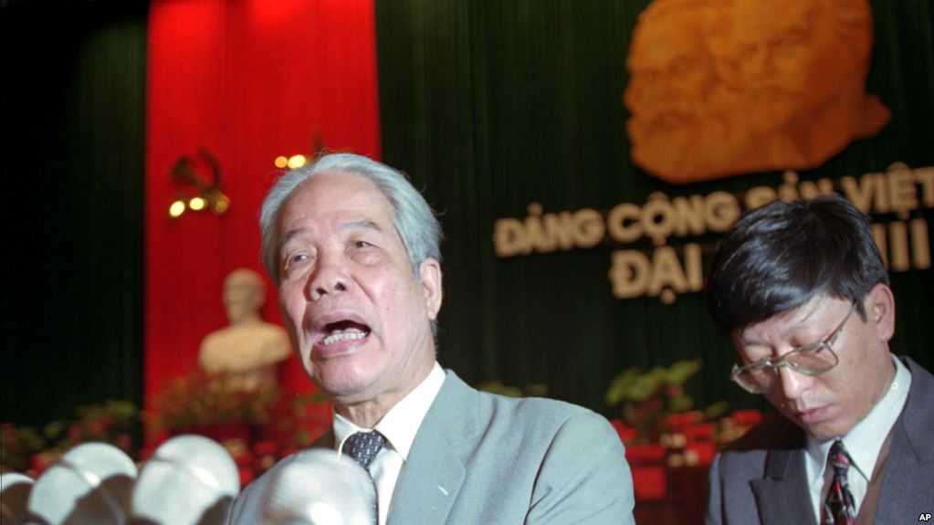 Ông Đỗ Mười phát biểu sau khi được bầu lại làm Tổng bí thư tại Đại hội Đảng lần thứ 8 vào năm 1996