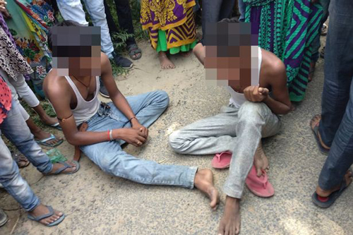 Những kẻ tấn công bị dân làng bắt tại hiện trường ở huyện Mainpuri, bang Uttar Pradesh hôm 2/10. Ảnh: Sun.