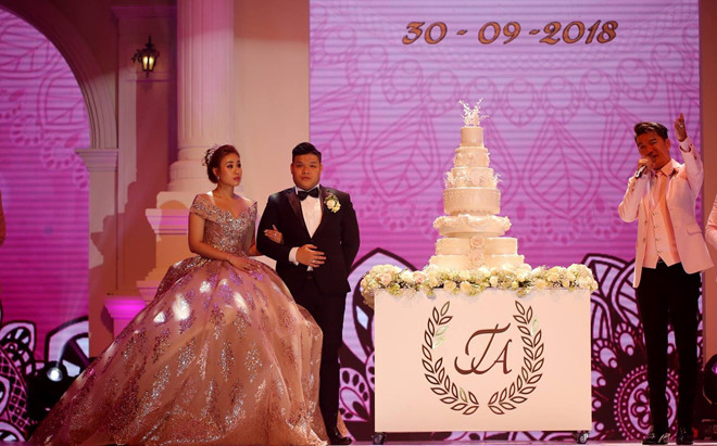 Đặc biệt, chú rể, cô dâu ngồi trên xe BMW mui trần đi vào tận sân khấu của tiệc cưới. Thực đơn các món ăn trong đám cưới đều theo tiêu chuẩn 5 sao. Bánh cưới 10 tầng, có 3 người khiêng. Thậm chí, còn có thông tin cho biết chi phí phục vụ cho “đám cưới thế kỷ” này không dưới 10 tỷ đồng.