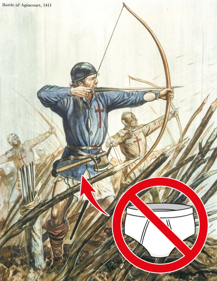 Trận Agincourt năm 1415 là một trong những chiến thắng quan trọng nhất trong Chiến tranh Trăm Năm của quân Anh trước quân Pháp đông đảo hơn về mọi mặt. Tuy nhiên trong trận chiến này, thắng lợi của quân đội Anh có phần hơi... kỳ cục, khi toàn bộ cung thủ của Anh khi ra trận đều không mặc quần.