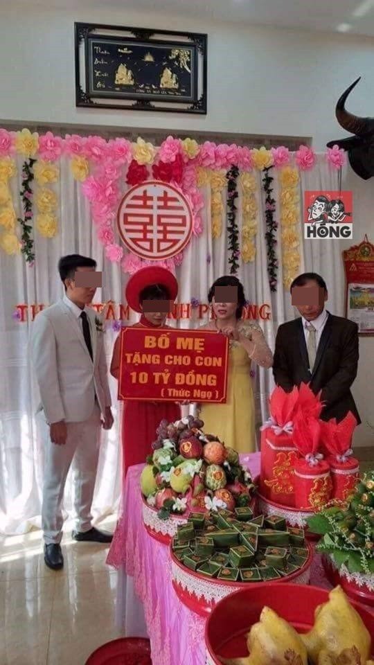 Trong bức ảnh, bố mẹ cô dâu đã làm một tấm bảng đỏ, dán chữ màu vàng với nội dung: "Bố mẹ tặng cho con 10 tỷ đồng" và trao cho đôi tân lang tân nương trên sân khấu. Trong tấm ảnh, có thể thấy bố mẹ và con gái, con rể đều rưng rưng khi nhận quà.