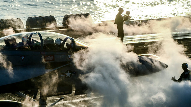 F/A-18 Super Hornet, một trong những máy bay chiến đấu hàng đầu của Mỹ, chuẩn bị cất cánh từ tàu sân bay USS Theodore Roosevelt vào tháng 12/2017.