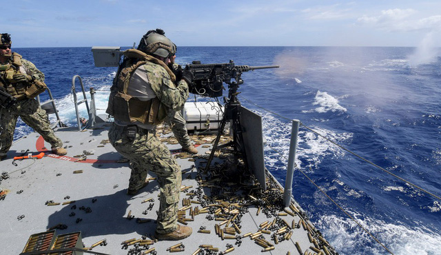 Binh sĩ Mỹ sử dụng súng máy M2 trên tàu tuần tra Mark VI tại biển Philippines.