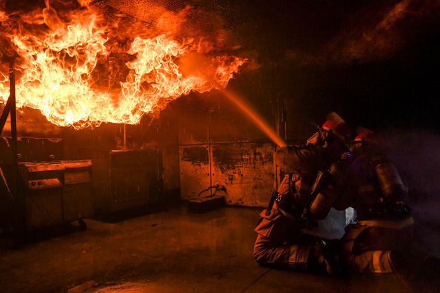 Các thủy thủ trên tàu sân bay USS Nimitz và tàu khu trục lớp Arleigh Burke USS Momsen luyện tập kỹ năng dập lửa.